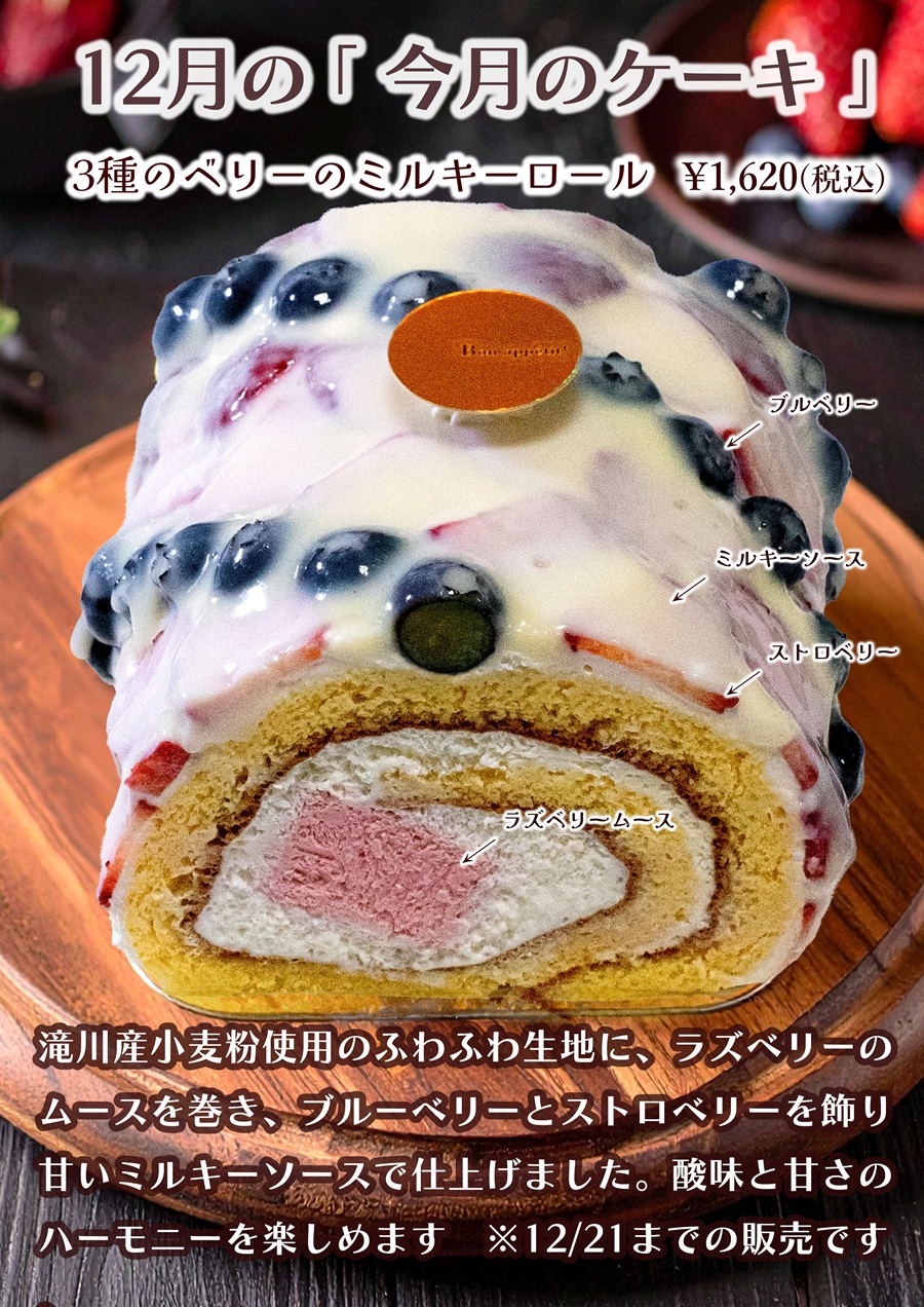 滝川産小麦粉使用のふわふわ生地にラズベリーのムースを巻き、ブルーベリーとストロベリーを飾り甘いミルキーソースで仕上げました。酸味と甘さのハーモニーを楽しめます。